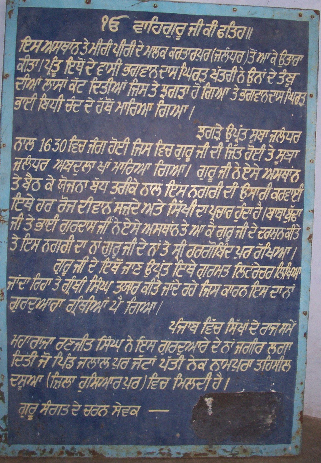 A new village called Gobindpur was established near the village of Ruhela, on the bank of the Beas river by Sri Guru Arjan Sahib Ji in 1587. Guru Arjan named this new village in honour of his young son Hargobind.