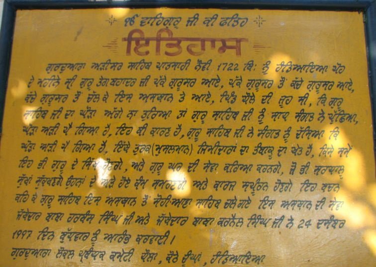 Sri Guru Tegh Bahadur Ji came here from Gurdwara Sri Gurusar Kacha Sahib. Guru Sahib's horse stopped and wouldn't move.