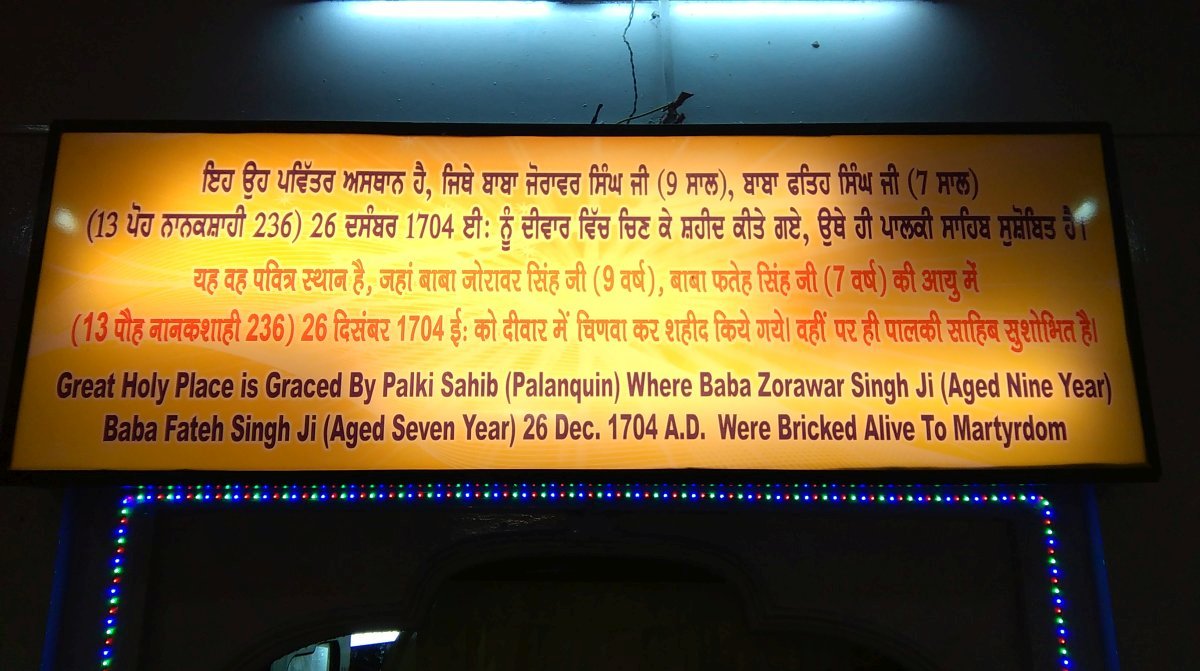Gurdwara Sri Fatehgarh Sahib marks the site of where the two young sons of Guru Gobind Singh were bricked alive, tortured and beheaded. The actual site is located in the Bhora Sahib which is underneath Gurdwara Sri Fatehgarh Sahib.