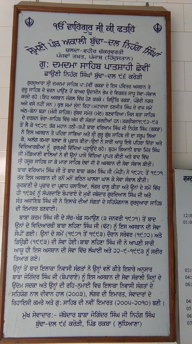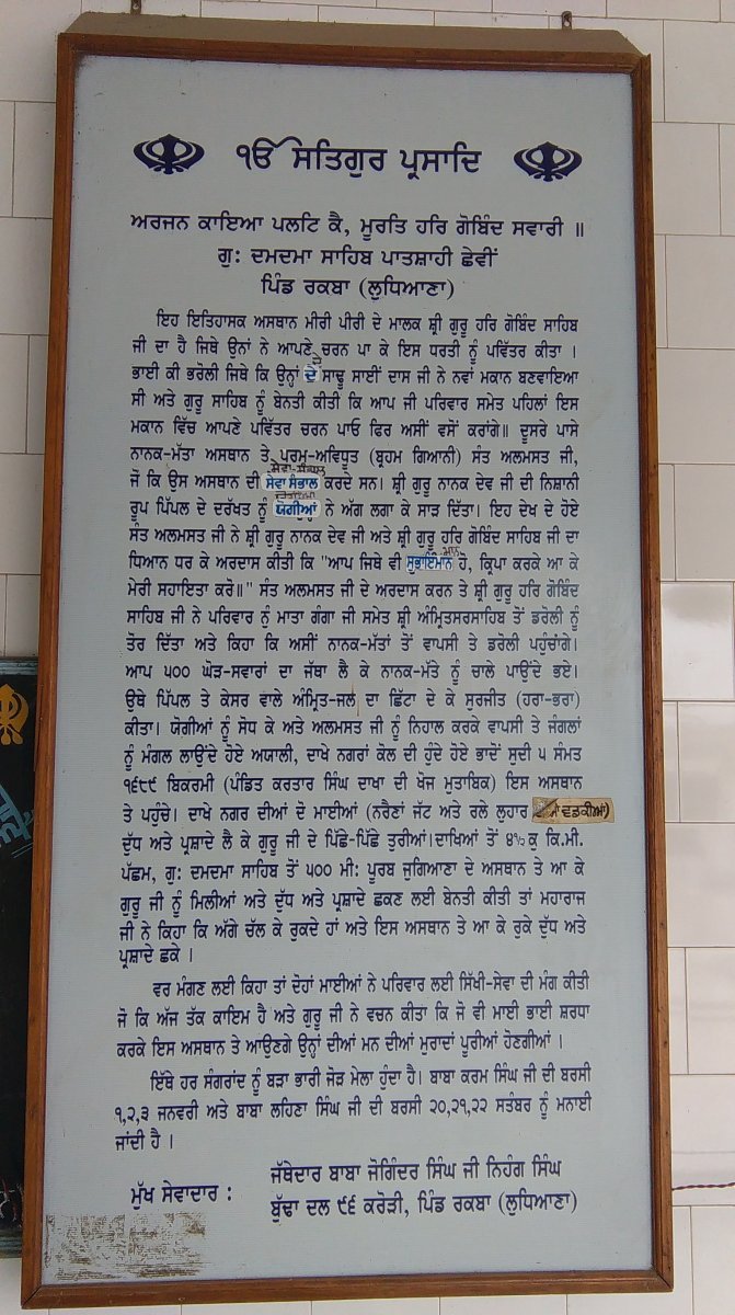 Sri Guru Hargobind Sahib Ji arrived and rested at this place after visiting Nanakmatta from Ayaali Kalan via Mullanpur Dakha.