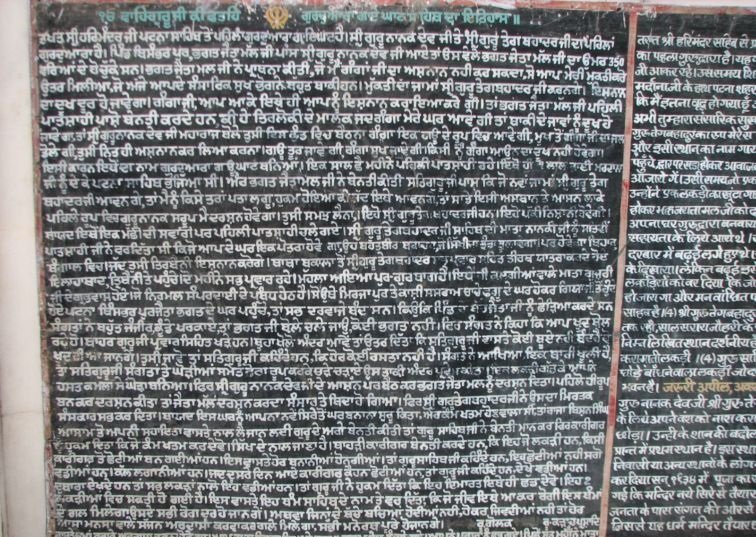 There is an old Sri Guru Granth Sahib Ji, hand written under the supervision of Bhai Nand Lal Ji Goya, which is very well maintained. Unless there is a fully occupied diwan hall, the Sri Guru Granth Sahib Ji is not allowed to be shown to any individual in order to limit its usage on account of its old age. Within the Gurdwara there beautiful ornamented marble columns which belong to the original house.