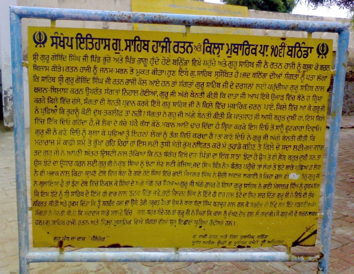 Gurdwara Qila Mubarak Sahib is situated inside the old Bathinda Fort. Haji Rattan Nagar is a part of Bathinda where a faqir used to live and meditate.