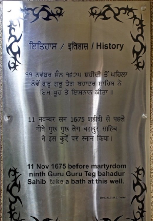 The present Gurdwara structure was built in 1930. The trunk of tree under which the Guru was beheaded is also preserved here as is the well from which he took bath while in the prison. Also standing adjoining the Gurdwara is the Kotwali (police station), where Guru Tegh Bahadur was imprisoned and his Sikhs were tortured.