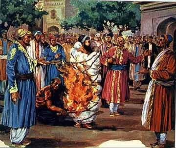 Dyal Das abused the Emperor and his courtiers for this infernal act. He was tied up like a round bundle and thrown into a huge cauldron of boiling oil. He was roasted alive into a block of charcoal. Mati Das condemned these brutalities. He was hacked to pieces limb by limb. The Guru witnessed all this savagery with divine calm.